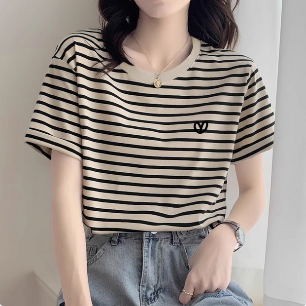 2025新款正肩条纹纯棉短袖t恤女时尚洋气宽松休闲上衣打底衫夏季